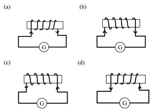 (v) The diagram below shows a magnet moved near a coil along its axis. Which of the diagram shows correct flow of current during this motion?